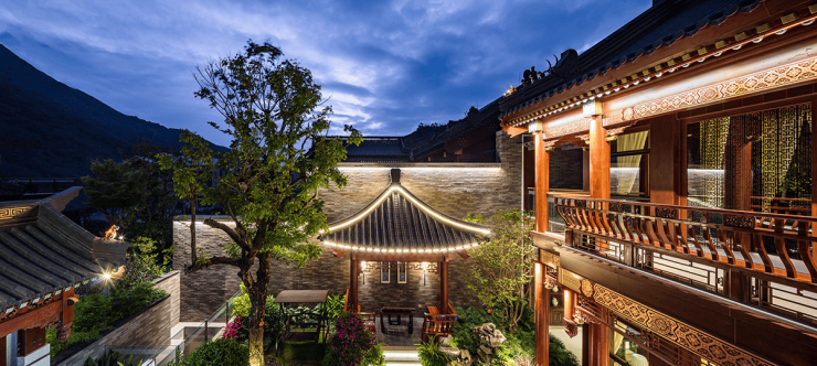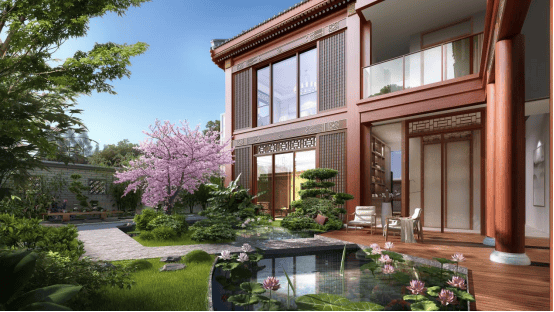麓府合院,严格遵照中国宅院建筑的型制,汉白玉石狮、门当、户对,大气巍然,宅门贵雅气象呼之欲出。