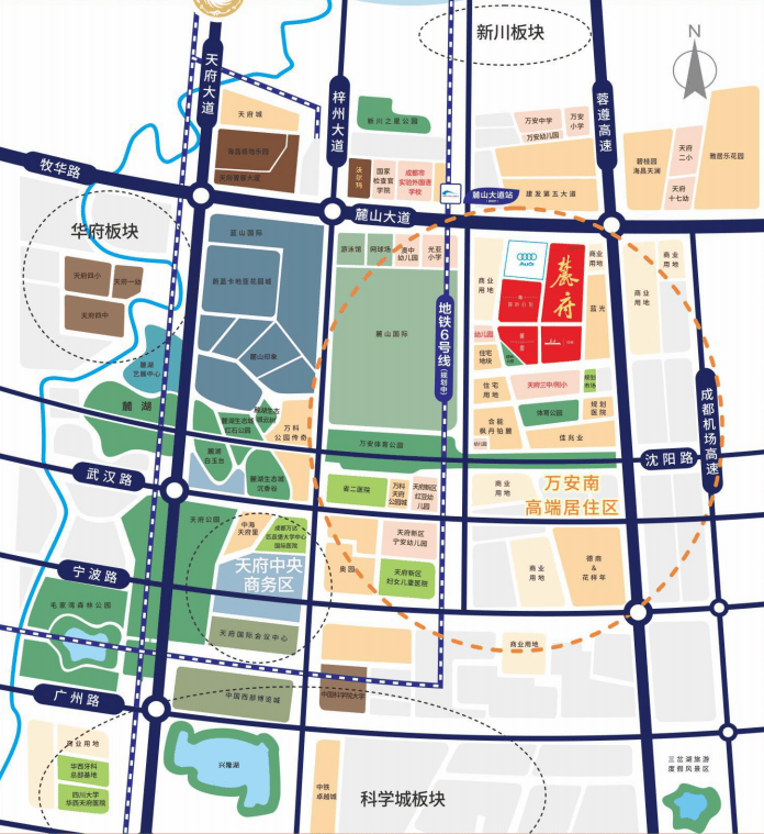 地段区域:高新区新川之心科技园板块和天府CBD板块(秦皇寺、兴隆湖)的驳接带。三大产业核心区的环伺,十五分钟生活圈内享麓湖的红石公园、天府公园、天府森林公园、万安体育公园,四大生态公园。