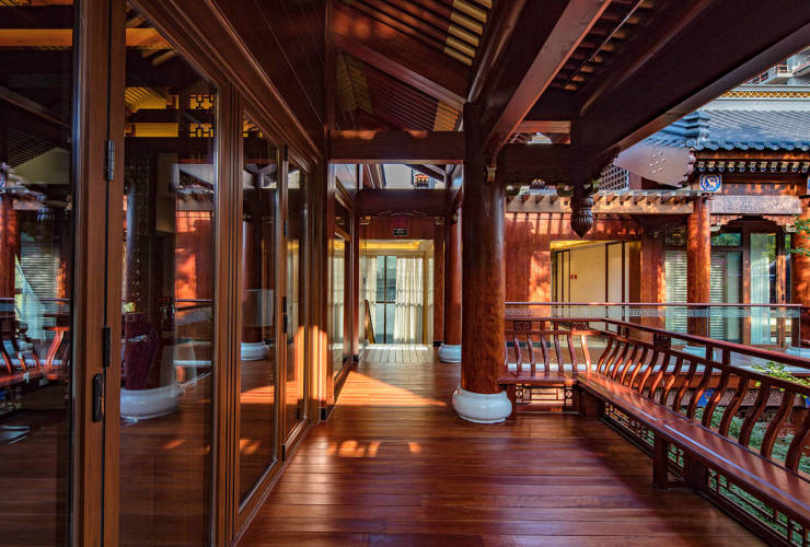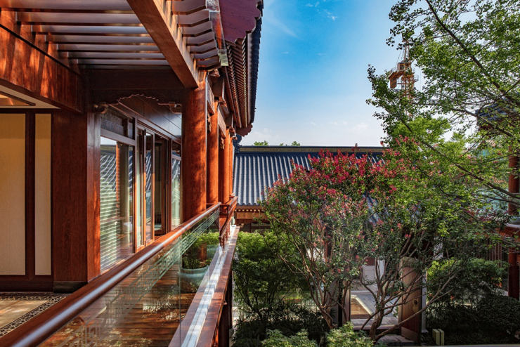 麓府合院中无论垂花、窗花、美人靠等细节之处的雕花,均以硬木类实木为材,辅以技艺精湛的大匠师采用现代的数控技法进行雕琢,以前沿技术完全再现中国传统建筑细节处理的经典手法。