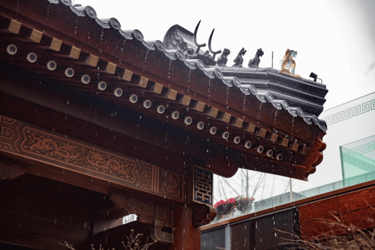麓府府院建筑,正脊两端为龙形吻兽,寓意“龙者”之形神,垂脊上排列三只走兽,分别为龙、凤、狮,精选故宫太和殿屋脊吻兽型制,与琉璃走兽一起, 均经由传统工匠精心雕琢而成。