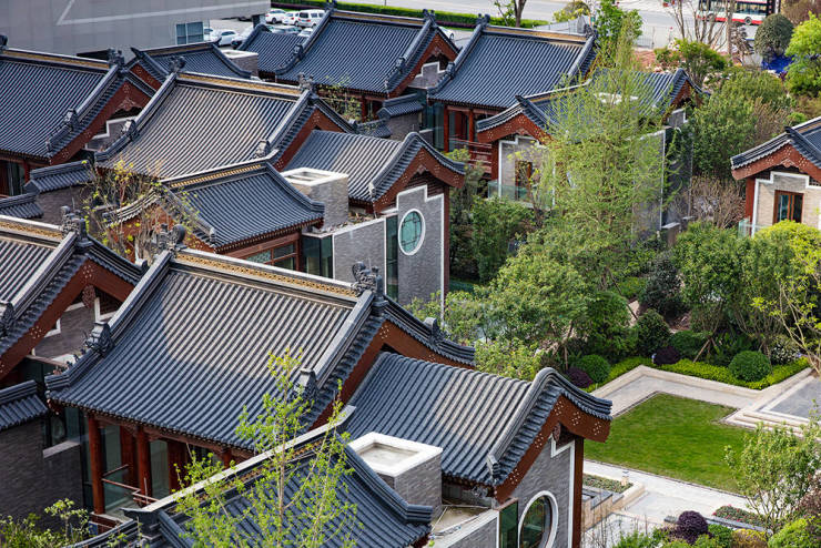 麓府,精心形制的屋顶飞檐檐口处采用红木、紫铜、青花瓷等材质,层次分明,每个构件讲究精美细致,建筑的尊贵感在其中充分彰显。