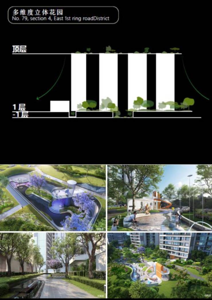 空间设计:四维立体社区居住新模式汲取新加坡垂直都市为灵感,打造下沉、地面、居家到顶层花园的四维立体,设计创造前沿的生活体验
