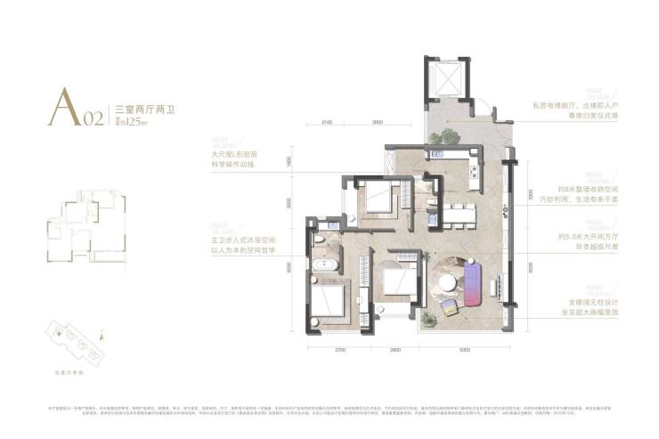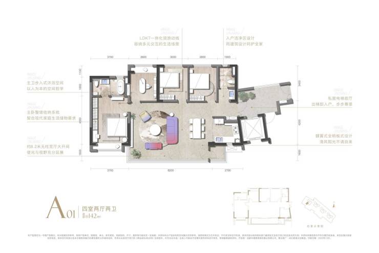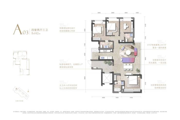 B.140m级户型做出超8米开间:拿项目的142m户型举例,它做出了约8.2米的客厅开间,全无柱无墙垛的设计是确保整个空间开阔的关键。