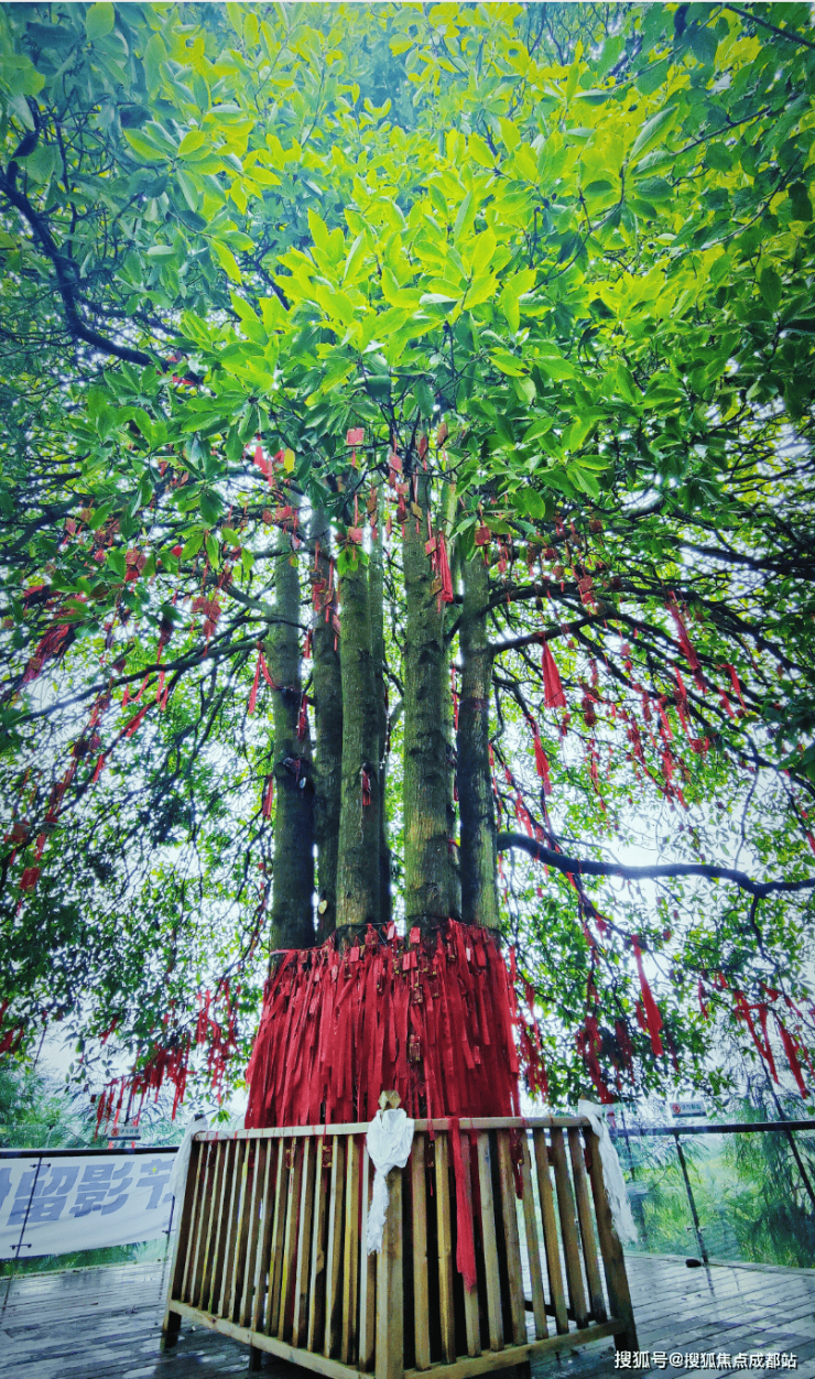 海子山景区云顶樱里与云漫伴山组团之间的空中栈道,在云端之下,穿梭于大树之间,前路有树叶遮挡,仿佛进入了一个神秘而又奇幻的世界。