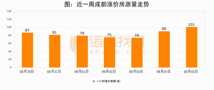根据诸葛找房数据显示,成都24小时涨价房源量为101套,较09月04日增加11套,环比上涨12.2%。与此同时,涨价房源占比小幅扩大,业主信心有所提升。