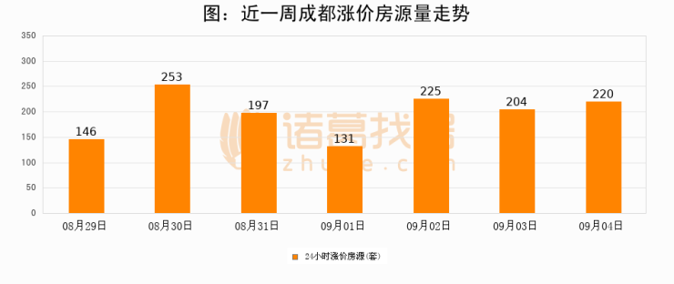 根据诸葛找房数据显示,成都24小时涨价房源量为220套,较09月03日增加16套,环比上涨7.8%。与此同时,涨价房源占比小幅扩大,业主信心有所提升。