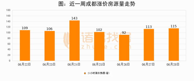 根据诸葛找房数据显示,成都24小时涨价房源量为115套,较06月27日增加2套,环比上涨1.8%。与此同时,涨价房源占比小幅扩大,业主信心有所提升。