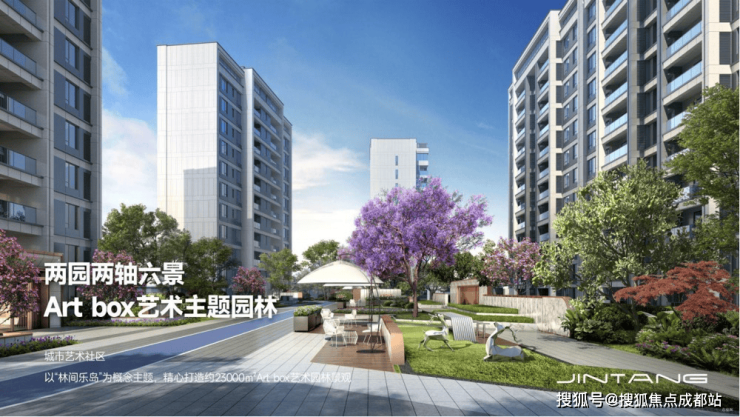 以"林间乐岛"为设计理念,打造23000㎡Art box艺术园林,呈现两园两轴六景的景观格局。