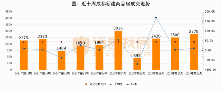 进入2024年第21周(05月20日-05月26日),成都新建商品房成交2778套,较上周增加278套,环比上涨11.1%