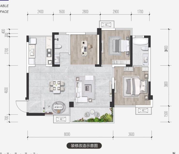 建筑面积:约52-96㎡,比市场同面积户型,使用空间更大,功能多1-2间