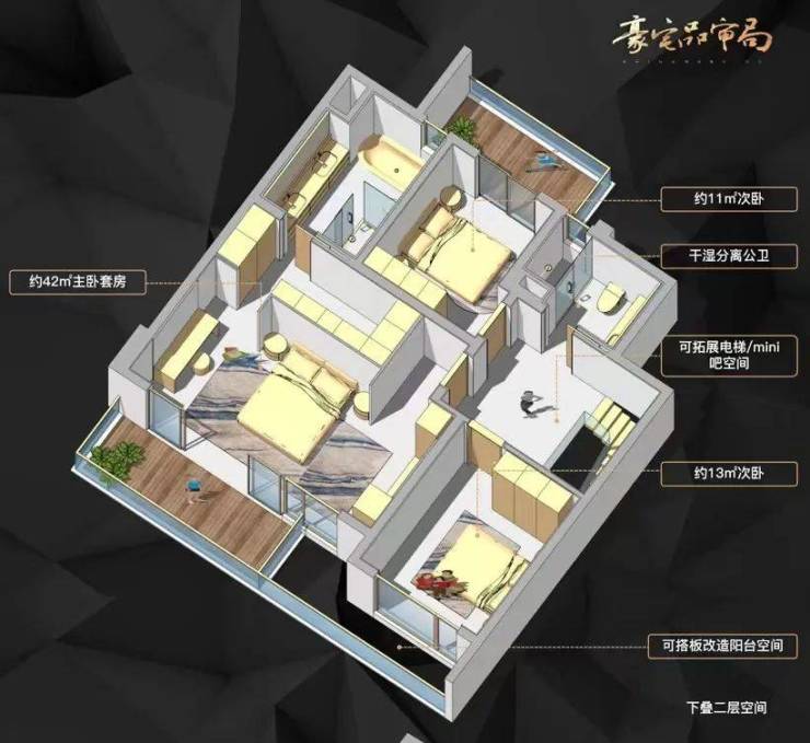以建面约230㎡下叠户型为例,南向9.9m面宽,三开间朝南。三面宽是豪华级叠拼硬性要求。