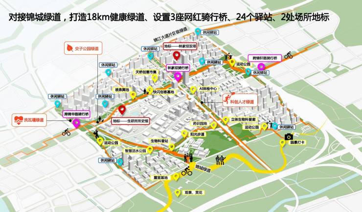 公园生态:东侧白鹭湾湿地公园,是成都首个国家级湿地公园(占地3000余亩,近1000亩水面)。西侧交子公园,是世界商圈的绿色引擎(西区已建成,总面积18.2万㎡,水域面积3.8万㎡的生态湖区)。南侧桂溪公园(约1800亩,集自然生态/科普教育/文化休闲于一体)。北侧锦江大道(约140亩绿化带采用花境与雨水花园间隔的布景)