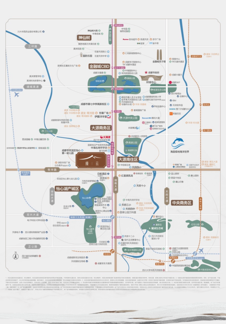 - 立体交通网:5/6/19号三地铁+四横三纵路网- 全龄教育链:石室天府、七中等名校环伺- 繁华商业圈:五大综合体+三大国际酒店(含在建)- 生态资源带:12600亩怡心湖+七大公园体系
