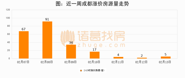 根据诸葛找房数据显示,成都24小时涨价房源量为5套,较02月12日增加3套,环比上涨150%。与此同时,涨价房源占比小幅扩大,业主信心有所提升。