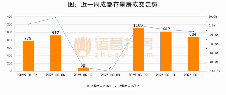 从存量房来看,2025年06月11日成都存量房单日成交884套,比昨日减少133套,环比下降13.1%。从近一周存量房成交来看,成都存量房日均成交套数为684套,06月11日单日成交884套,高于近一周平均水平29.2%。