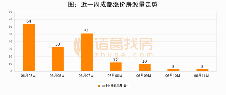 根据诸葛找房数据显示,成都24小时涨价房源量为3套,较06月10日持平。