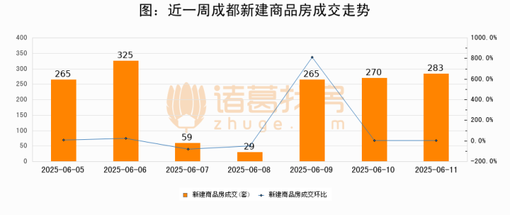 根据成都市住房和城乡建设局数据显示,2025年06月11日成都新建商品房成交283套,较昨日增加13套,环比上涨4.8%