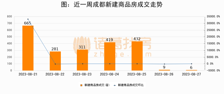 根据成都市住房和城乡建设局数据显示,2023年08月27日成都新建商品房成交6套,较昨日减少3套,环比下降33.3%