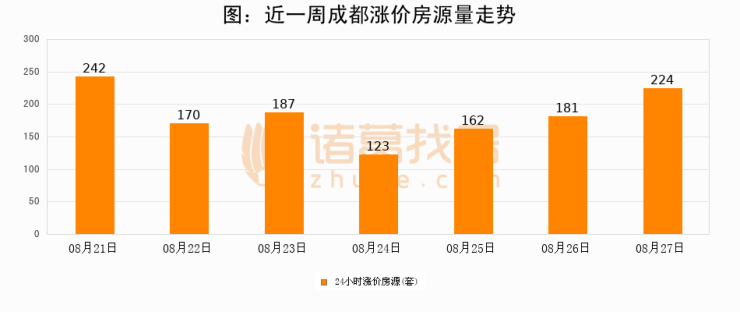根据诸葛找房数据显示,成都24小时涨价房源量为224套,较08月26日增加43套,环比上涨23.8%。与此同时,涨价房源占比小幅扩大,业主信心有所提升。