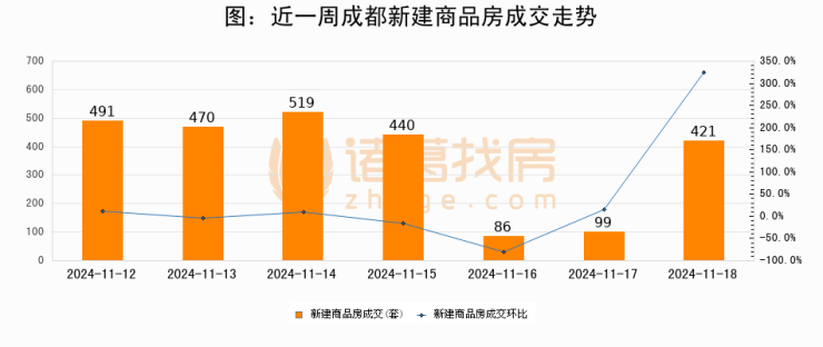 根据成都市住房和城乡建设局数据显示,2024年11月18日成都新建商品房成交421套,较昨日增加322套,环比上涨325.2%