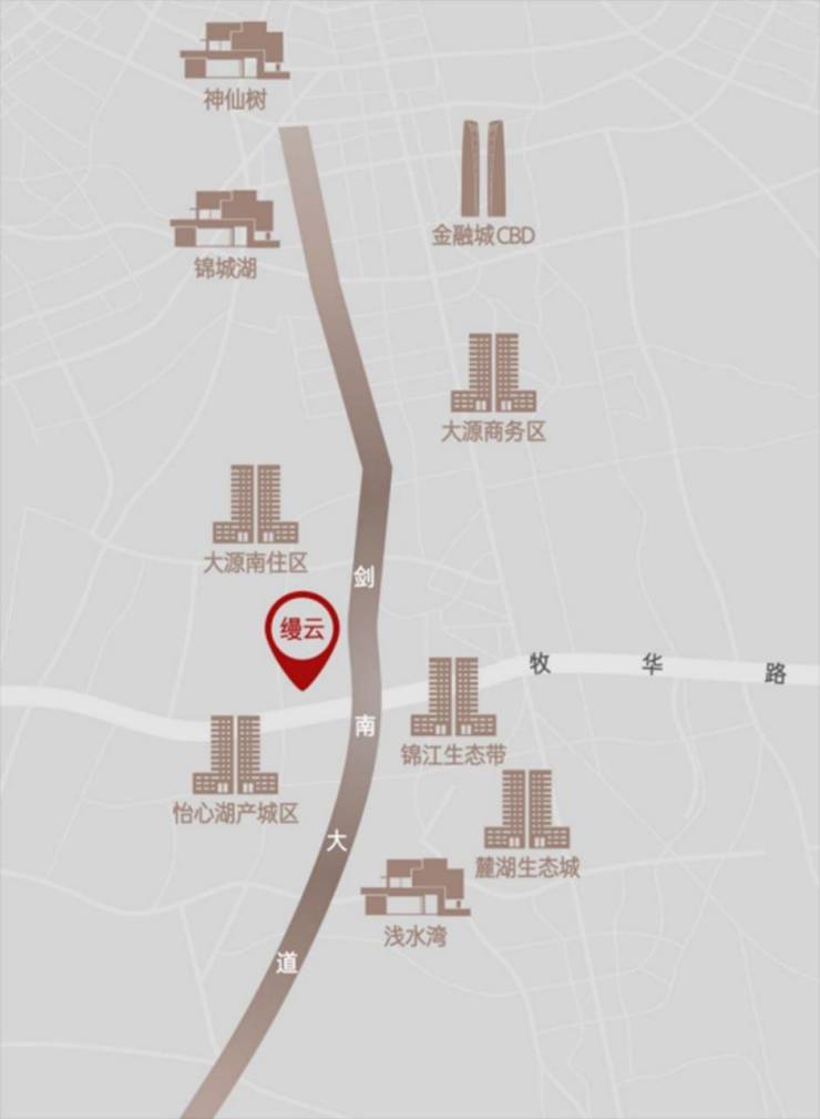 【区域优势凸显】建发华润缦云项目位于城南剑南大道与牧华路主干道交汇处,地处怡心湖以北片区,是城南改善中轴上的优质项目,尽享天府生活资源头排优势。【剑南大道——改善轴线】剑南大道以神仙树为起点,沿线分布着众多城南品质住区。神仙树、金融城CBD、锦城湖、大源商务区、大源南住区、锦江生态带、怡心湖产城区、浅水湾等成都知名的豪宅住区,都因剑南大道而串联起来,形成了一条独特的改善居住轴线。