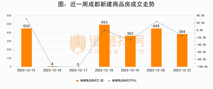 根据成都市住房和城乡建设局数据显示,2023年12月21日成都新建商品房成交384套,较昨日减少65套,环比下降14.5%