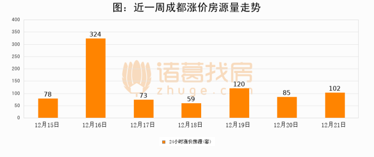 根据诸葛找房数据显示,成都24小时涨价房源量为102套,较12月20日增加17套,环比上涨20%。与此同时,涨价房源占比小幅扩大,业主信心有所提升。