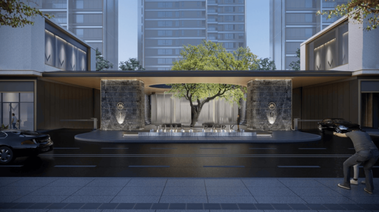 主入口采用门庭与景观一体化设计。超30米阔尺仪门与约5.6米挑高,采用深灰石材墙面与铝板顶饰,彰显尊崇气质;