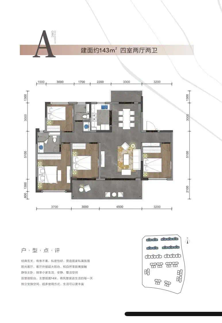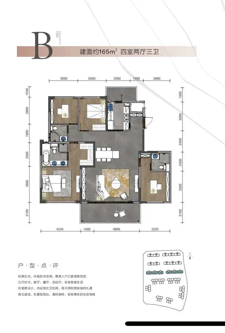 该户型完全的南北通透,餐客厅南北侧均设置阳台,景观视野较好。客厅开间有4.5米,南向观景阳台进深有2.1米、宽度达到了7.5米,空间尺度较大。此外,老人房与年轻人起居室保持距离,方便日常生活起居。145㎡套四三卫:分布于6、8-10号楼