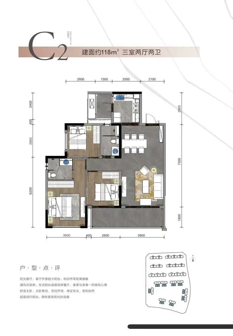 该户型除了宽景阳台外,较大的亮点就是套四三卫的功能区设计,让老年人的生活起居更加便利。同时,主卧不仅有独立卫生间,还有专属衣帽间,更提升品质感。118㎡套三双卫: