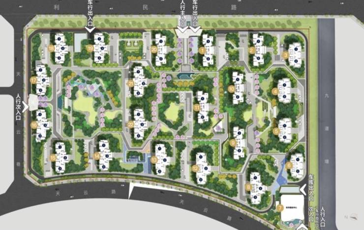 【9】高层区域围合式布局,约1万平米中庭。小区整体绿化密集达23350㎡。