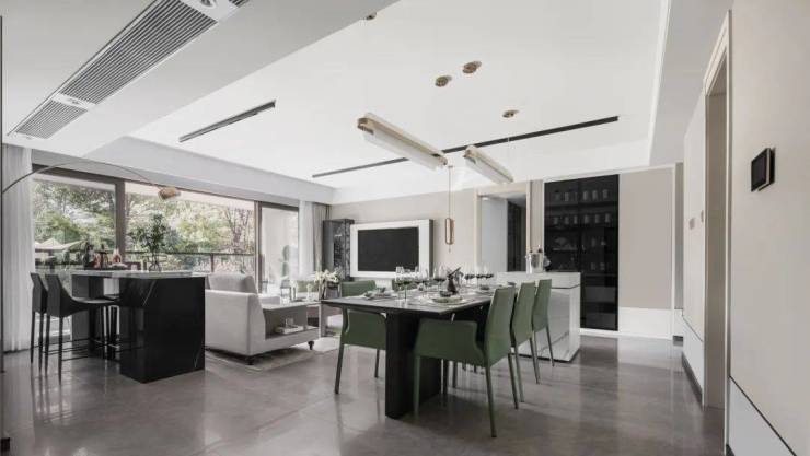 约46㎡超大方厅,宽阔敞亮。不仅有能容纳十人桌的餐区,更有无论是清晨简餐还是夜晚独酌都能轻松驾驭的私享吧台。保证功能完善的同时,仍有大量空间可根据需要改造,比如入户处打造玄关,沙发后区域作为儿童娱乐场所。
