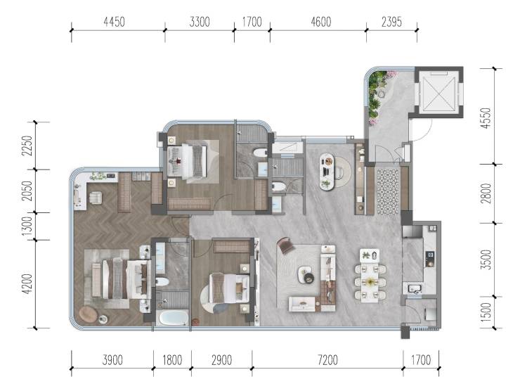 交付标准:3990元/㎡全精装交付,全景落地窗