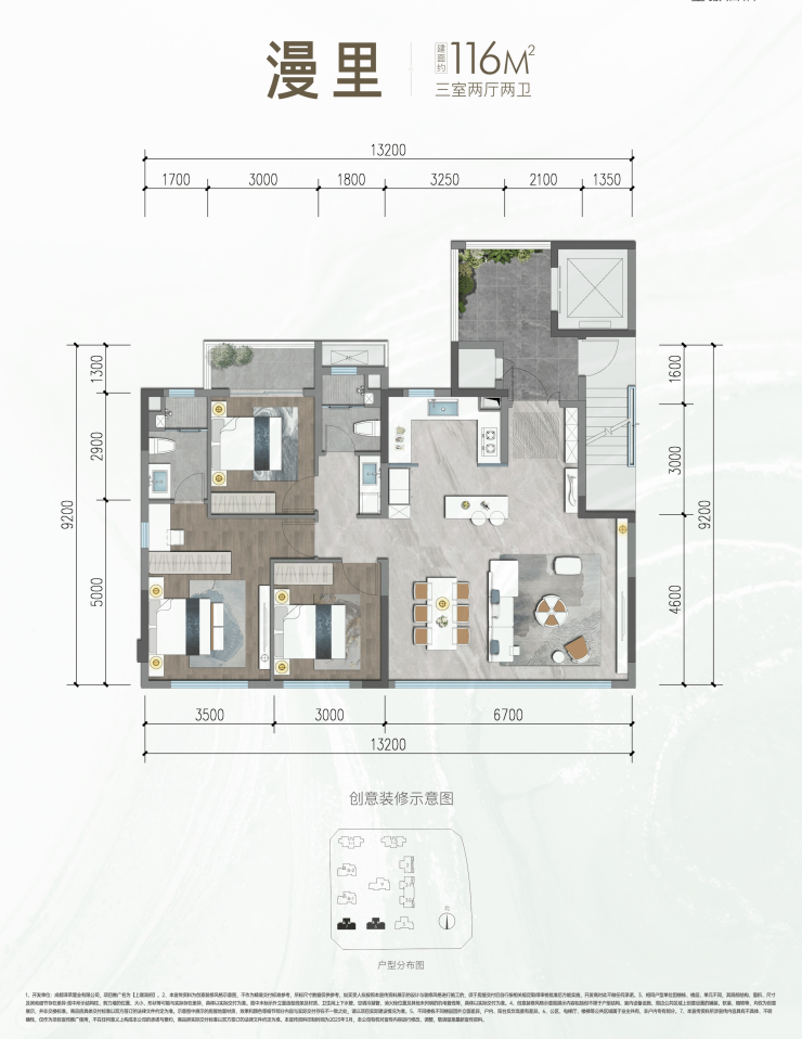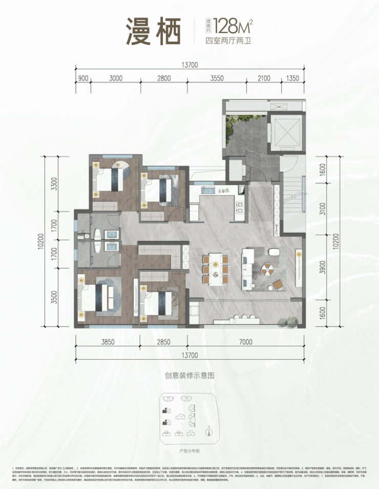 「四面宽朝南」:双卧室、餐厅、客厅功能空间全南向,形成约13.7m的南向大面宽;约7m「观景阳台」推窗见景,清风徐来。