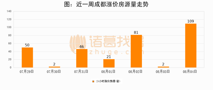 根据诸葛找房数据显示,成都24小时涨价房源量为109套,较08月03日增加107套,环比上涨5350%。与此同时,涨价房源占比小幅扩大,业主信心有所提升。