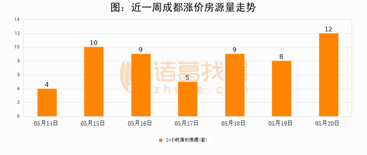 根据诸葛找房数据显示,成都24小时涨价房源量为12套,较05月19日增加4套,环比上涨50%。与此同时,涨价房源占比小幅扩大,业主信心有所提升。