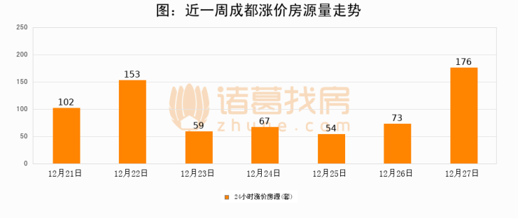 根据诸葛找房数据显示,成都24小时涨价房源量为176套,较12月26日增加103套,环比上涨141.1%。与此同时,涨价房源占比小幅扩大,业主信心有所提升。