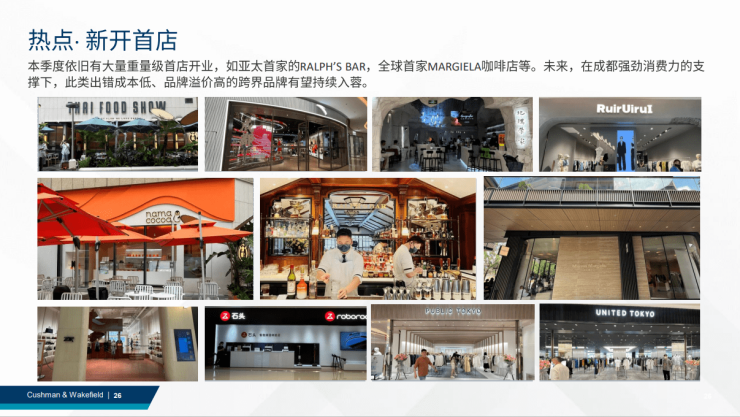 本季度依旧有大量重量级首店开业,如亚太排名前列的Ralph’s Bar,全球排名前列Margiela咖啡店等。未来,在成都强劲消费力的支撑下,此类出错成本低、品牌溢价高的跨界品牌有望持续加码成都优质零售物业市场。