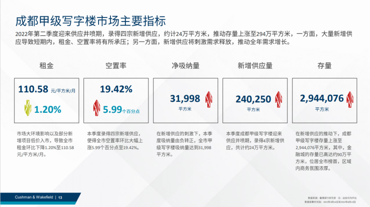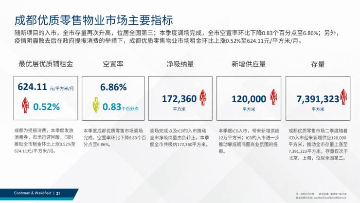 近日,戴德梁行正式发布了《2022年第二季度成都商业地产市场回顾与展望》报告,对城市发展、甲级写字楼、优质零售物业等三个市场进行了回顾,并对其未来发展进行了展望。