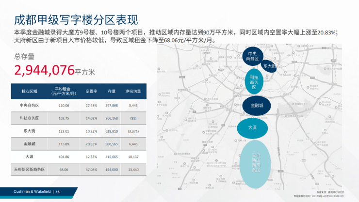 2022年第二季度,成都甲级写字楼录得4宗新增供应,共计约24万平方米。在新增供应的推动下,成都甲级写字楼存量上涨至2,944,076平方米,其中,金融城的存量已高达约90万平方米,位居全市榜首,区域内商务氛围浓厚。市场大环境影响以及部分新增项目低价入市,导致全市租金环比下降1.20%至110.58元/平方米/月;另外,大量的新增供应,使得全市空置率环比大幅上涨5.99个百分点至19.42%。