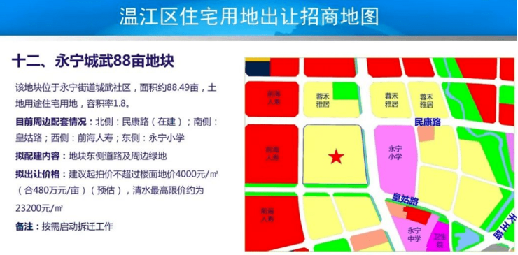 本次公布的已纳入储备计划住宅用地资源,其中,清水限价较高达23200元/㎡地块共3宗,均位于永宁城武片区、永宁小学旁,容积率均为1.8。