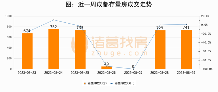 从存量房来看,2023年08月29日成都存量房单日成交741套,比昨日增加12套,环比上涨1.7%。从近一周存量房成交来看,成都存量房日均成交套数为525套,08月29日单日成交741套,高于近一周平均水平41.1%。