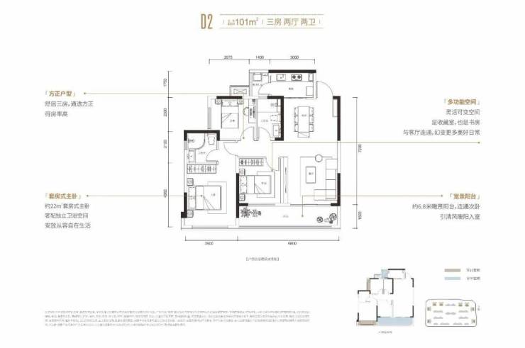 这个户型最大的亮点就是在百平的面积,设计了“双阳台”,“6.8*1.6米”的宽幕景观阳台,直接连通次卧。更别说,它的套房式主卧面积有约22㎡,无浪费,空间感十足。