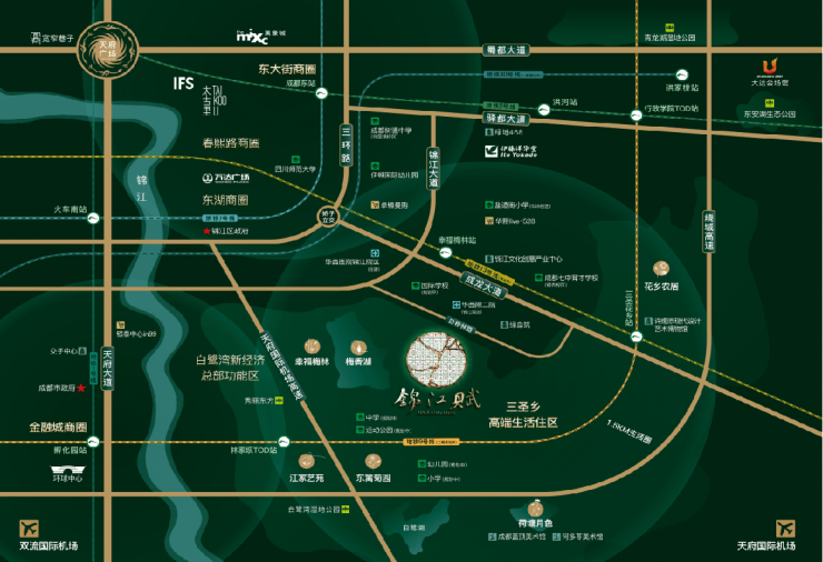 锦江赋位于成都市锦江区三圣乡板块,这一区域自古便是成都的繁华之地,被誉为“百业云集,市廛兴盛”。项目地处锦江大道与成龙大道交汇处,紧邻华西第二医院锦江院区,周边交通便捷,地铁13号线、2号线贯穿而过,南三环路、成龙大道等主干道四通八达,为居民出行提供了极大的便利。