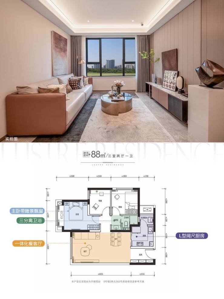 户型:88㎡三室两厅一卫,经典竖厅设计,——满足了购房者首套置业的需求。
