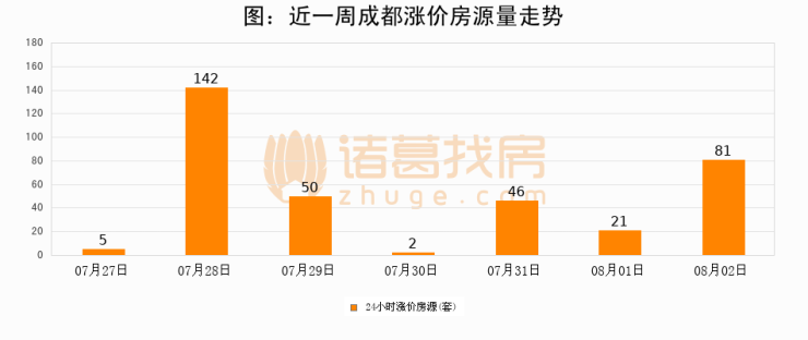 根据诸葛找房数据显示,成都24小时涨价房源量为81套,较08月01日增加60套,环比上涨285.7%。与此同时,涨价房源占比小幅扩大,业主信心有所提升。
