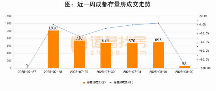 从存量房来看,2025年08月02日成都存量房单日成交55套,比昨日减少640套,环比下降92.1%。从近一周存量房成交来看,成都存量房日均成交套数为548套,08月02日单日成交55套,低于近一周平均水平90%。