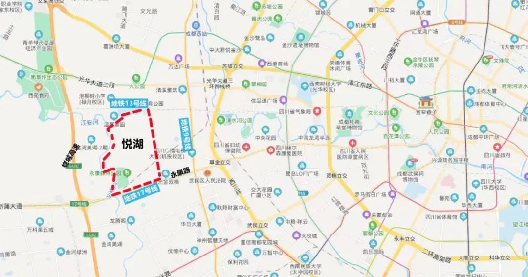 悦湖科技城是原武侯电商产业功能区拆分而来,位于白佛桥地铁站以北,属于大的武侯新城板块,整体规划面积约22.3平方公里。