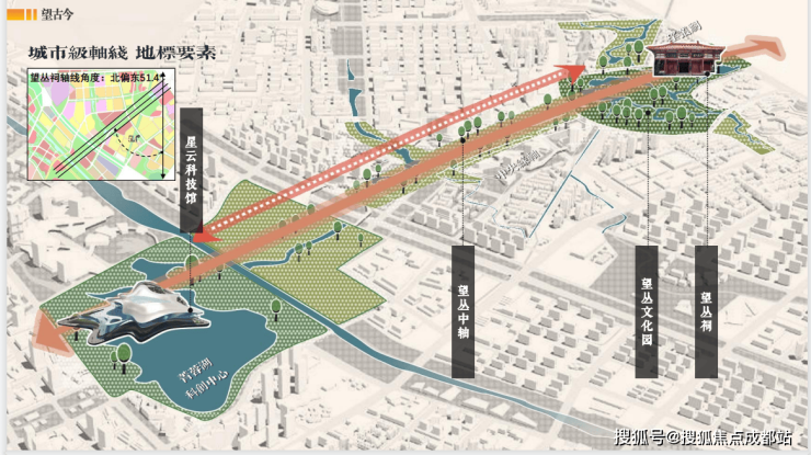 串联望丛祠与成都科幻馆,形成“一轴串双核,一园望古今”的空间格局