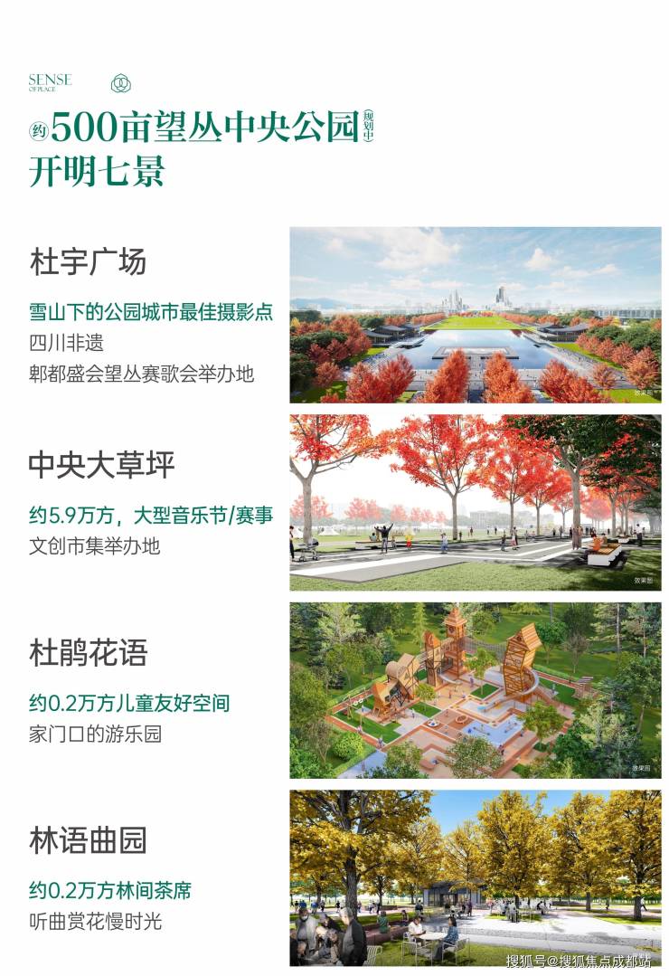 规划杜宇广场、开明广场、杜鹃花语等七大景观节点,包含约5.9万㎡中央大草坪、约1.7万㎡核心水景,未来可承载音乐节、望丛赛歌会等文化演艺活动,融合亲子休闲、文化体验与研学科普功能
